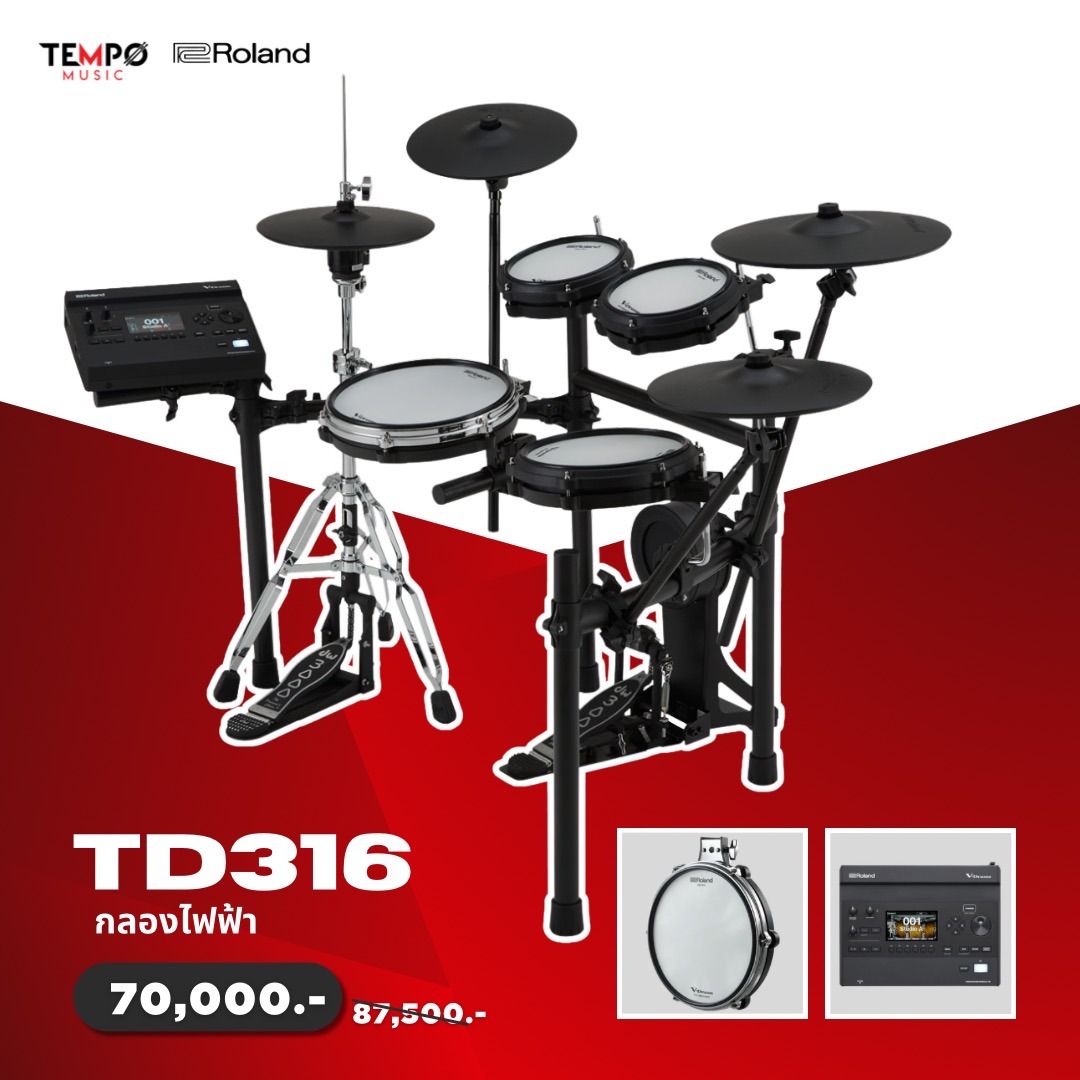 กลองไฟฟ้า Roland TD316 ถูกออกแบบมาเพื่อมือกลองที่ต้องการพัฒนาฝีมืออย่างจริงจัง แต่ยังต้องการควบคุมระดับเสียงให้เหมาะกับบ้านหรือคอนโด รุ่นนี้ให้สัมผัสการเล่นใกล้เคียงกลองจริงมากขึ้นด้วยแผ่นหนังกลองแบบหนังมุ้งที่ตอบสนองแรงตีได้ละเอียด ตีเบาเสียงยังชัด ตีแรงเสียงยังคุมโทนได้อยู่